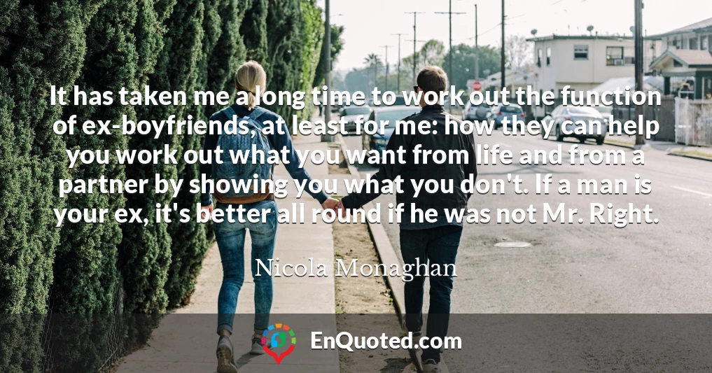 It has taken me a long time to work out the function of ex-boyfriends, at least for me: how they can help you work out what you want from life and from a partner by showing you what you don't. If a man is your ex, it's better all round if he was not Mr. Right.