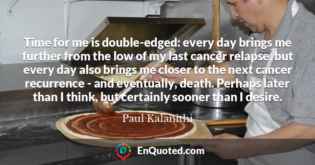 Time for me is double-edged: every day brings me further from the low of my last cancer relapse, but every day also brings me closer to the next cancer recurrence - and eventually, death. Perhaps later than I think, but certainly sooner than I desire.